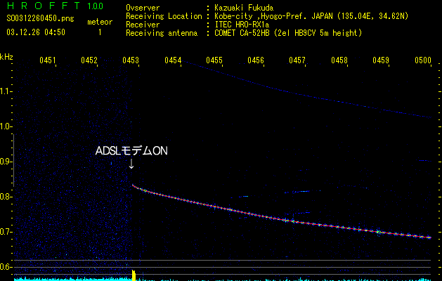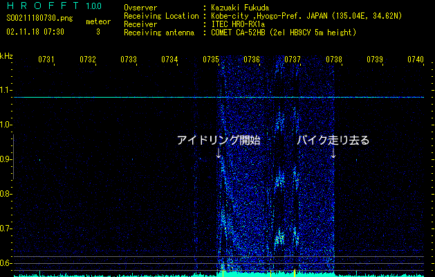 流星電波観測を初めて間もなく、毎朝7時半前後に妙なノイズが入るのに気付きました。ところがなかなか原因がつかめません。継続時間は2〜4分ほどで、ちょっとだけ我慢すれば済んでしまうので、それほど気にしなくなりました。