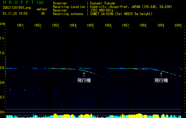 人工のノイズでも身近な原因のものばかり紹介してきましたが、こちらは少し遠いところのもの。飛行機が鯖江からのビーコン電波を反射して、入感しているものです。弧を描いているのはドップラー効果で反射された電波の周波数が変わっているためです。高い方から低い方へ動いているので、こちらから遠ざかる飛行機のものなのでしょうか。