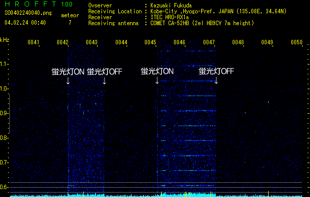 こちらは部屋の蛍光灯のノイズです。電源をONにした瞬間、雷と同じような縦一線のノイズが入ります。スピーカーをつけていても「ザザッ」と雷のような音が聞こえます。蛍光灯がつくときは放電現象が起きていますから、似ているのは当たり前ですね。0045〜0047の間は、縞模様が出ています。縞と縞の間隔は60Hzで、なにやら電力に関係したものだと伺えます。