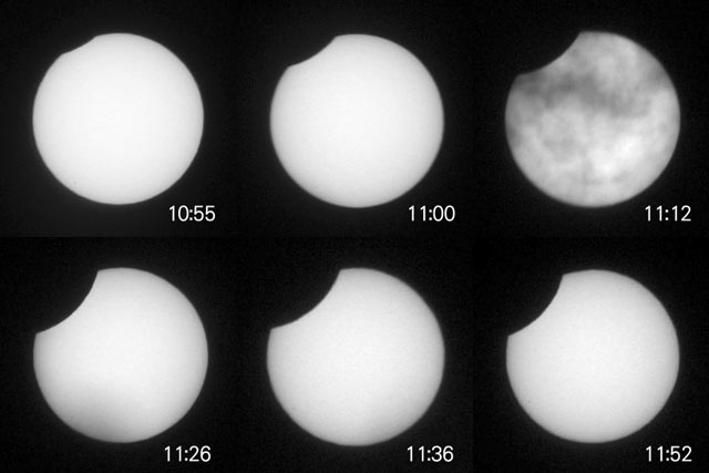 1/600秒〜1/800 撮影地:神戸市兵庫区 撮影機材等: ペンタックス タンクローG 8×24双眼鏡(手持ちコリメート撮影) ビクセン日食グラス使用 キヤノン Powershot A70 5.4-16.2mm(16.2mm側で撮影) F8 ISO50設定 ※グレースケールに変換、レベル補正、トリミング、縮小処理済み |