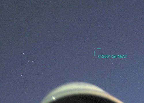 「二大彗星接近!」と話題になったその一つ、C/2001 Q4 ニート彗星だ。当初の予報よりちょっと暗めで、残念がっている人も多いと思うが、期待の分を割り引いてみれば、久しぶりの明るい彗星には違いない。なにせ神戸市内でも、7×50双眼鏡を向けたら、一発で見つかるくらいなのだ。といっても4等級程度で、さすがに肉眼では無理。