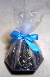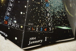 2003年は立体の地球付きという不思議なデザインのカレンダーでしたが、2004年は輪をかけて、けったいなスタイルのカレンダーが出てきました。 ラッピングされた状態で、こんなんです。 なにやら黒っぽい六角錘が入っています。 |