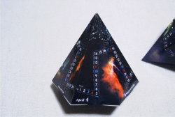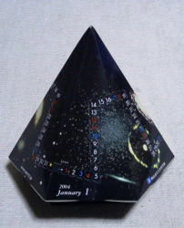 | あけるとこんなんです。六角錘の表面がカレンダーになっていて、銀河や球状星団の写真をちりばめたデザインです。材質は紙で、ポッキーなどのお菓子の箱に使われているのと同じような感じ、いや、きれいに光沢が出ているのであれより一段上等です。 で、このカレンダーですが、1月から3月までしかないのです。いったいどうなっているかといいますと…… |