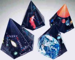 | 中からまた六角錘が出てきました。いろんな星雲の写真をちりばめた4月〜6月のカレンダーです。で、ここにもミシン目の切り込みが入っていて、中を開けると、次は7〜9月のカレンダーが出て来るという仕掛けです。 | ![]() |