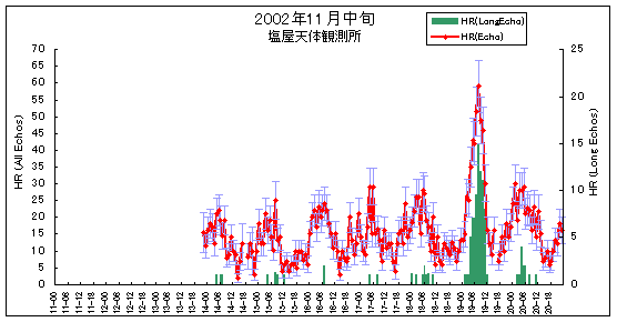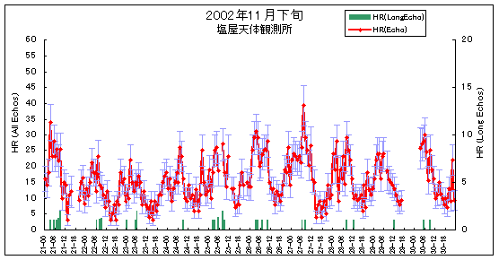 ↑"14-12"は、14日12時(JST)を表しています。目盛りは6時間ごとです。LT 00 01 02 03 04 05 06 07 08 09 10 11 12 13 14 15 16 17 18 19 20 21 22 23 ←地方時(JST) UT 15 16 17 18 19 20 21 22 23 00 01 02 03 04 05 06 07 08 09 10 11 12 13 14 ←世界時 --------------------------------------------------------------------------------------------------- November 2002 13 -- -- -- -- -- -- -- -- -- -- -- -- -- -- -- -- -- -- -- -- -- -- %16 %11 ←エコー数 ←ロングエコー数 14 16 18 17 12 21 22 19 %14 19 8 9 14 10 9 2 7 IF IF IF %8 12 IF 3 10 1 1 1 15 18 12 12 21 16 19 14 %10 %25 13 14 4 6 7 4 6 6 10 5 10 10 %7 9 6 1 1 1 1 16 15 20 22 17 23 20 22 24 22 18 15 11 15 10 3 10 8 7 8 20 13 9 12 21 2 17 14 10 9 17 29 15 29 15 %16 13 7 16 11 12 12 7 %4 12 %15 16 12 24 14 16 1 1 18 %18 %22 26 26 15 28 27 %19 %17 10 20 6 14 7 6 12 11 10 9 %12 11 7 10 13 1 1 1 2 1 1 1 19 %13 15 26 25 35 43 42 %52 59 49 46 30 16 12 9 16 IF 7 9 14 10 18 14 17 1 1 1 5 7 7 9 15 12 11 8 1 20 24 30 19 28 28 29 21 %23 22 16 23 14 %22 %15 7 8 10 6 7 10 13 12 18 16 1 1 4 2 2 1 1 21 16 14 18 34 23 28 23 %25 %22 %25 %10 15 14 3 11 %12 IF IF IF IF %9 15 %16 %8 1 1 1 1 2 22 13 %11 15 21 18 18 12 %23 %14 %13 11 7 12 9 3 5 8 3 9 8 18 15 16 9 1 1 1 23 11 10 22 15 12 15 14 17 15 8 12 8 7 4 9 3 9 6 %8 11 11 15 17 18 1 1 2 24 13 16 9 13 15 18 15 26 23 16 10 9 14 %10 11 6 %13 9 6 11 25 15 11 12 1 25 19 10 18 25 26 %19 IF IF 27 18 %14 %23 IF 13 13 7 8 8 14 18 %14 IF %15 %14 1 1 1 2 1 26 %13 25 29 31 29 20 21 %24 25 25 28 15 13 13 8 %12 11 9 11 14 19 18 26 14 1 1 1 1 27 22 24 23 22 23 21 26 %39 29 25 %20 %26 %16 15 4 8 9 4 7 %9 5 14 10 11 1 1 28 24 19 28 9 19 16 23 %14 29 25 22 16 10 11 %9 10 11 6 14 7 18 %13 11 13 1 1 29 16 22 24 24 16 23 24 IF %19 %16 15 14 13 11 9 8 %9 IF IF IF IF IF IF IF 1 30 IF IF IF %26 27 28 30 %24 %16 25 19 16 10 11 15 %11 10 8 10 7 13 9 22 %9 1 1・ロングエコーは20秒以上エコーが観測された数を示しています。