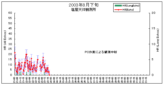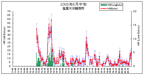 ※中旬はグラフの縦のスケールが他の月と異なっています。ご注意ください。LT 00 01 02 03 04 05 06 07 08 09 10 11 12 13 14 15 16 17 18 19 20 21 22 23 ←地方時(JST) UT 15 16 17 18 19 20 21 22 23 00 01 02 03 04 05 06 07 08 09 10 11 12 13 14 ←世界時 --------------------------------------------------------------------------------------------------- August 2003 13 48 30 39 31 18 20 17 13 18 7 9 11 %8 9 1 5 4 2 %1 6 6 9 12 36 ←エコー数 5 1 2 3 3 3 2 2 2 1 1 1 1 ←ロングエコー数 14 41 54 37 44 43 45 59 28 19 21 10 %4 IF 7 4 4 4 11 6 IF %4 7 20 12 4 3 5 3 2 7 4 6 5 2 1 15 11 %12 %19 %13 %15 %9 %19 %5 %17 -- %10 %6 %4 %3 %3 %4 %3 %0 ES IF %3 %10 %1 %3 1 3 1 2 1 1 16 %10 %9 %8 %3 %4 %6 %7 %4 %10 %9 %8 %6 %5 %1 %9 %4 %3 %3 %5 '- IF %7 %6 %6 1 1 1 1 17 %7 %7 %2 %17 %37 %20 %28 %23 %17 %14 -- %3 %9 %9 -- %5 9 %3 -- -- %10 %15 %14 %9 18 %9 %0 %6 %0 %5 -- %8 %13 %2 -- -- %2 %2 %0 %4 %4 -- -- %3 4 6 10 10 11 19 12 8 7 3 2 7 4 4 0 2 %2 %0 %2 2 %6 3 %2 1 3 2 3 9 %5 7 1 20 19 8 3 4 8 4 5 5 6 5 6 4 %5 3 7 %4 %3 2 4 2 9 %16 10 %18 1 1 21 %22 16 7 4 3 7 2 %10 12 5 11 6 6 9 12 NS %1 5 4 %12 8 12 20 20 1 1 1 1 1 1 22 11 14 4 10 6 13 6 5 16 9 6 3 7 9 10 5 7 4 4 8 15 15 -- -- 2 1 23 -- %8 10 4 7 8 8 14 17 10 7 11 3 5 4 7 3 7 3 3 -- -- -- -- 1・ロングエコーは20秒以上エコーが観測された数を示しています。