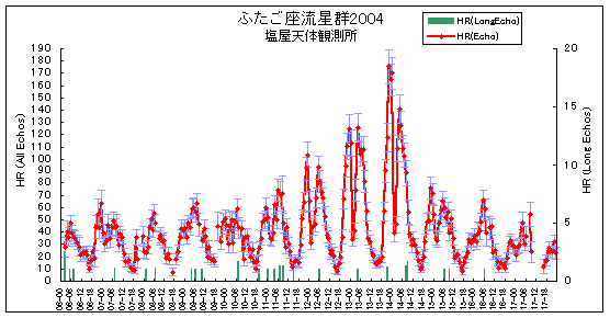 ↑"14-12"は、14日12時(JST)を表しています。目盛りは6時間ごとです。LT 00 01 02 03 04 05 06 07 08 09 10 11 12 13 14 15 16 17 18 19 20 21 22 23 UT 15 16 17 18 19 20 21 22 23 00 01 02 03 04 05 06 07 08 09 10 11 12 13 14 ------------------------------------------------------------------------------------ December 2004 01 25 30 30 32 42 %48 47 %38%56 47%47 36%25 20 23%15 9 25 17 19 27 %28 %29 NS 1 02 %33%35%29 %43 %50 45 54 63%51 37%39 27 34%37 23 21 17 12 23 15%24 %35 NS %38 1 03 %31%21 30 54 39 %44 %45 49%64%41%37%39 17 27%25 14 12 8 16 20%25 30 28 17 1 04 22%32%31 36 35 42 %40 %38%43 50 35 40 29%25 24 13 17 19 17 19 23 26 19 %24 1 1 05 %16 26%35 %30 %30 %34 NS %38 NS%34%27%30 17 19 17 15 16%10%24 NS 32 NS NS NS 1 1 06 NS NS%28 %41 %36 47 39 36%35%32%28 21 23 23 24 21 10 17 24%18%44 %55 %44 %63 1 1 1 07 %39%30%33 %45 %35 44 49 %44%45%29%39 36 22 16 16%17 11 10 9%35 NS NS NS %36 1 08 %24%23%28 %44 %51 42 55 %47 IF%35%38 32%33 19%23 18 NS %8 NS%18%24 %36 43 41 1 1 09 43 36 47 44 59 60 56 63%46 NS 33 43 37 20%28 18 18 16 NS NS NS %32 48 51 1 1 1 10 %46%30 -- 50 %31 %48 %59 %43 IF%43%18%36 37 27 20%26 16 10%16 27 35 48 50 60 1 1 11 52 35 34 39 62 50 74 %71%71%47 28 44%30 24 12 16 17 16 15 29 51 64 %92%104 1 1 1 1 1 12 65%32%44 %47 68 93 81 72%67 53%38%35%22 25%21%12 8 14%19 36 67 94%111%125 1 13 113 34 41 74 126 104%108 108 81%57 35 32 22%20%14 14 17 16%19 57 90%118%176%165 1 1 14 170%39 46 109 141 128 109 103%89%57%38 29 34 29 23%17 10 12 20%32 48 %49 76 71 1 1 15 54 35 33 47 58 65 60 52%57 39 51 35%19 21%21 16 12 8 15%19%23 %34 %31 33 1 1 16 37%32%38 %41 48 66 59 IF IF%43%44 23 25%16%11 15 14 13%10 19 31 33 %28 %28 1 17 21 28 29 42 %47 %31 %36 NS%54 IF IF IF IF IF IF IF IF 17 17 27 24 24 32 23 18 33 33%40 %30 %63 47 57 %56%34%43%44 33%31 23 23 NS %8 12 13 9%14 %13 %21 NS 1 1 1・LTは地方時。ここでは日本標準時(JST)です。UTは世界時。データの上段はエコー数、下段はロングエコー数。ロングエコーは20秒以上エコーが観測された数を示しています。