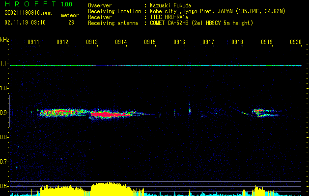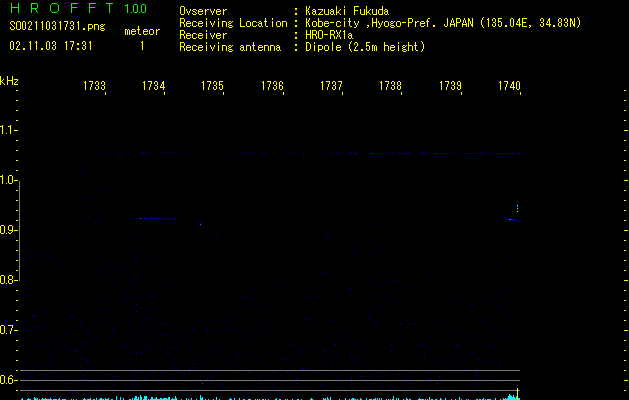 2002年11月3日、17時39分でした。アンテナを繋いで待つことしばし。まるで信号がないまま「あかんなぁ〜」と思っていたら、「ポーン!」と甲高いエコーの音!