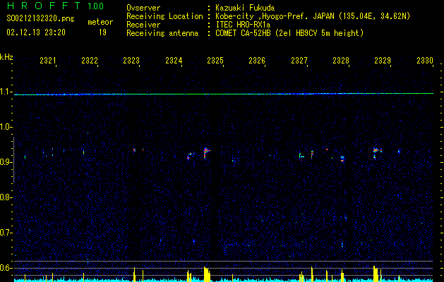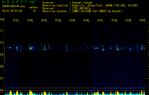 2004年のしぶんぎ座流星群です。ふたご群より若干継続時間の長いエコーが多いです。2004年は顕著な出現を見せ、エコーだらけでカウント不能寸前になる観測サイトもありました。塩屋天体観測所でも上図の通りひっきりなしにエコーが受信されました。これ以上になると数えるのがイヤになってきます(^_^)。うれしいですけど。