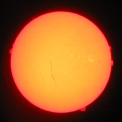 | 2004年12月21日08:30(JST) 望遠鏡 Coronado P.S.T.(f=400mm) アイピース PENTAX XL10.5mm カメラ Canon PowerShot A70 5.4-16.2mm F2.8-4.8 (ワイド端5.4mmで使用・手持ちコリメート) 露出 1/30 絞りF2.8 ISO=50(マニュアル) |