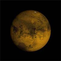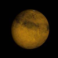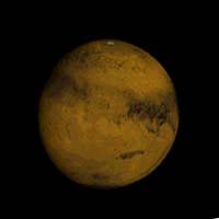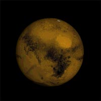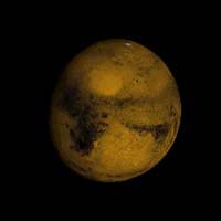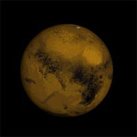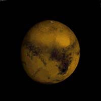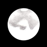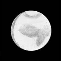2003年7月16日02:05(JST) 中央経度255.6度 中央緯度-20.7度 視直径19.3秒 望遠鏡 タカハシMT-130(f=800mm) アイピース PENTAX XL5.2mm(154倍) シーイング 2/5 透明度 3/5 13cm反射でスケッチをとってみたのですが、望遠鏡の温度順応が不十分で、大シルチスから小シルチスにかけての暗部がやっと見える程度でした。南極冠が心なしか小さくなったような気がします。 |